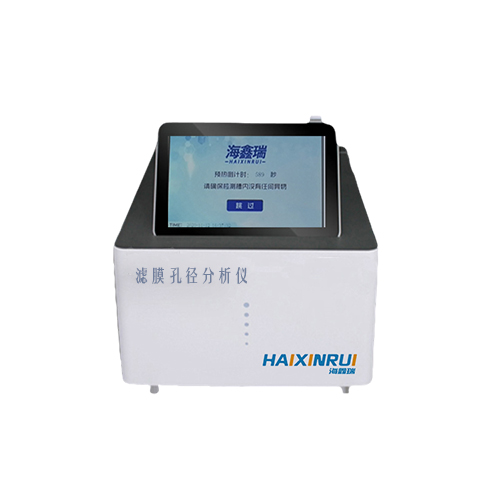 以某種膜材料為例,將膜用可與其浸潤的液體充分潤濕,由于表面張力的存在,浸潤液將被束縛在膜的孔隙內(nèi);給膜的一側(cè)加以逐漸增大的氣體壓強(qiáng),當(dāng)氣體壓強(qiáng)達(dá)到大于某孔徑 內(nèi)浸潤液的表面張力產(chǎn)生的壓強(qiáng)時(shí),該孔徑中的浸潤液將被氣體推出;由于孔徑越小,表面張力產(chǎn)生的壓強(qiáng)越高,所以要推出其中的浸潤液所需施加的氣體壓強(qiáng)也越高;同樣可知, 孔徑**的孔內(nèi)的浸潤液將首先會(huì)被推出,使氣體透過,然后隨著壓力的升高,孔徑由大到 小,孔中的浸潤液依次被推出,使氣體透過,直至全部的孔被打開,達(dá)到與干膜相同的透過率; 首先被打開的孔所對(duì)應(yīng)的壓力,為泡點(diǎn)壓力,該壓力所對(duì)應(yīng)的孔徑為**孔徑; 在此過程中,實(shí)時(shí)記錄壓力和流量,得到壓力-流量曲線;壓力反應(yīng)孔徑大小的信息,流量反應(yīng)某種孔徑的孔的多少的信息;然后再測(cè)試出干膜的壓力-流量曲線,可根據(jù)相應(yīng)的公式計(jì)算得到該膜樣品的**孔徑、平均孔徑、*小孔徑以及孔徑分布、透過率。