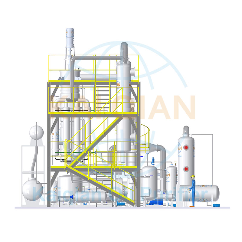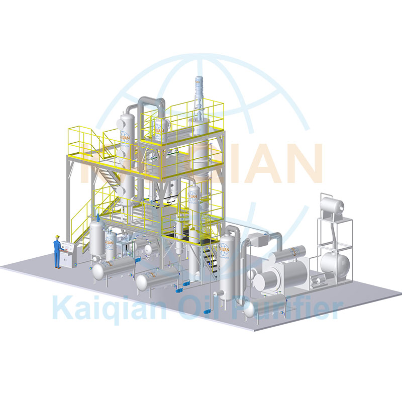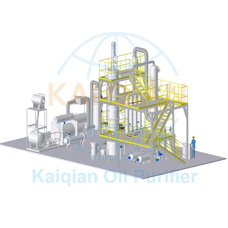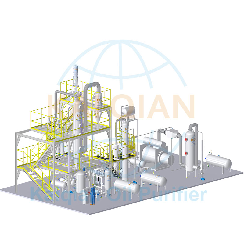 以廢舊輪胎、廢舊塑料熱裂解處理的固體垃圾回收油品再利用的技術(shù),已經(jīng)在世界范圍內(nèi)得到快速推廣,不但消除了部分固體白色垃圾對環(huán)境的污染,而且實現(xiàn)了能源的再生利用,但是廢輪胎、廢塑料熱裂解后的毛油,大部分應(yīng)用是作為熱能燃料。因裂解過程中會產(chǎn)生炭黑,炭黑隨著油氣進入冷凝系統(tǒng),故油品顏色較黑,雜質(zhì)較多,且熱值不高,利用率較低;而少數(shù)采用簡單脫色沙對油品進行簡易處理,此技術(shù)處理精度較低,加工過程中油品損失嚴(yán)重,而且脫色沙過后的油品化學(xué)性質(zhì)不穩(wěn)定,極容易被氧化,造成油品顏色變黑,雜質(zhì)多,經(jīng)濟效益損失較大,可采用高真空精餾設(shè)備裝置對塑料輪胎毛油精煉提純得到更清潔透明的燃料油。